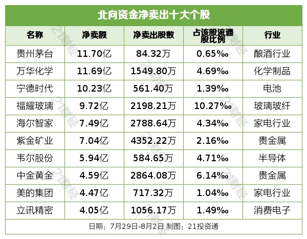 北向资金净卖出贵州茅台(600519.SH)、万华化学(600309.SH)、宁德时代(300750.SZ)、福耀玻璃(600660.SH)、海尔智家(600690.SH)居前,其中,贵州茅台被净卖出11.70亿元,万华化学被净卖出11.69亿元,宁德时代被净卖出10.23亿元,福耀玻璃被净卖出9.72亿元,海尔智家被净卖出7.49亿元。