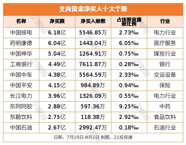 净买入中国核电6.18亿元,净卖出贵州茅台11.70亿元个股方面,北向资金净买入中国核电(601985.SH)、药明康德(603259.SH)、中国神华(601088.SH)、工商银行(601398.SH)、中国中车(601766.SH)居前,其中,中国核电被净买入6.18亿元,药明康德被净买入6.04亿元,中国神华被净买入5.04亿元,工商银行被净买入4.49亿元,中国中车被净买入4.38亿元。