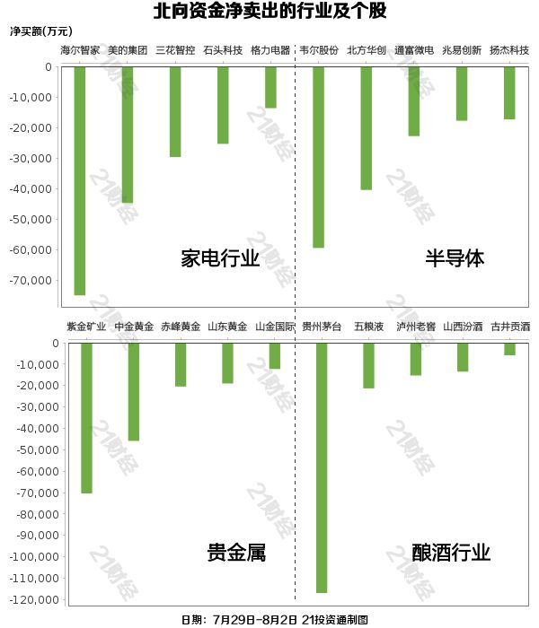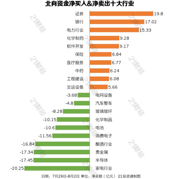 北向资金减持了29个行业,其中家电行业最多,净卖出金额达20.25亿元,其次是半导体行业,净卖出17.45亿元。