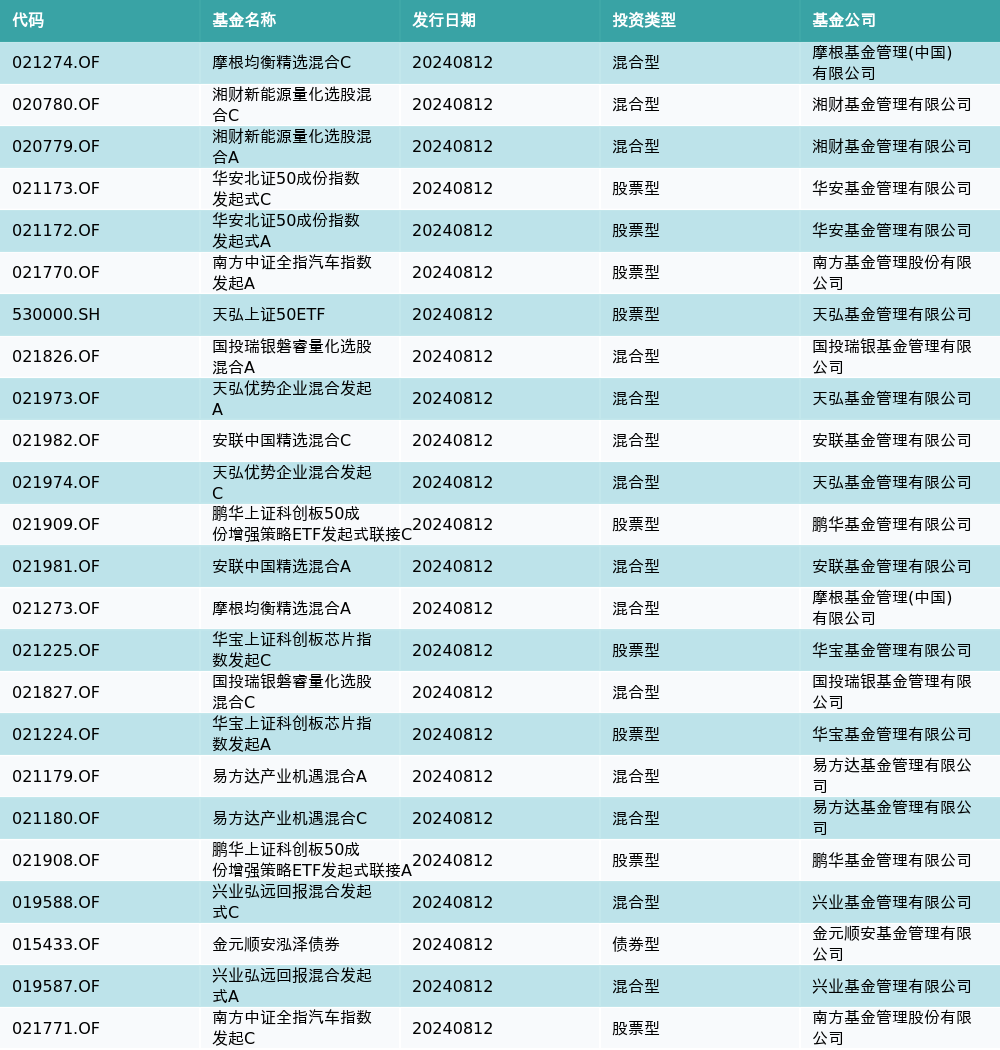 8月12日有24只新基金发行,分别为:摩根均衡精选混合C、湘财新能源量化选股混合C、湘财新能源量化选股混合A、华安北证50成份指数发起式C、华安北证50成份指数发起式A、南方中证全指汽车指数发起A、天弘上证50ETF、国投瑞银磐睿量化选股混合A、天弘优势企业混合发起A、安联中国精选混合C、天弘优势企业混合发起C、鹏华上证科创板50成份增强策略ETF发起式联接C、安联中国精选混合A、摩根均衡精选混合A、华宝上证科创板芯片指数发起C、国投瑞银磐睿量化选股混合C、华宝上证科创板芯片指数发起A、易方达产业机遇混合A、易方达产业机遇混合C、鹏华上证科创板50成份增强策略ETF发起式联接A、兴业弘远回报混合发起式C、金元顺安泓泽债券、兴业弘远回报混合发起式A、南方中证全指汽车指数发起C,详情见下表: