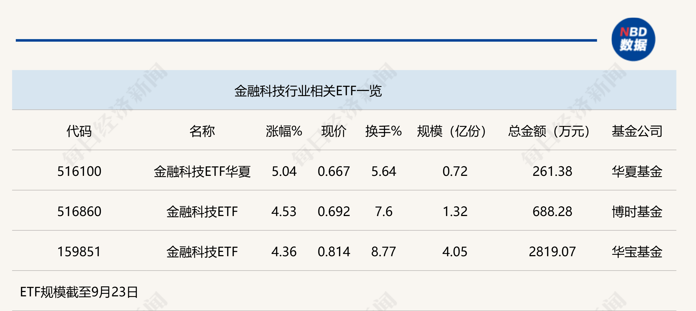 今日上午,整个大金融板块爆发,其中,金融科技和券商表现抢眼,而金融科技ETF华夏(516100)半日涨幅达到5.04%,是ETF市场唯二涨幅超过5%的品种。