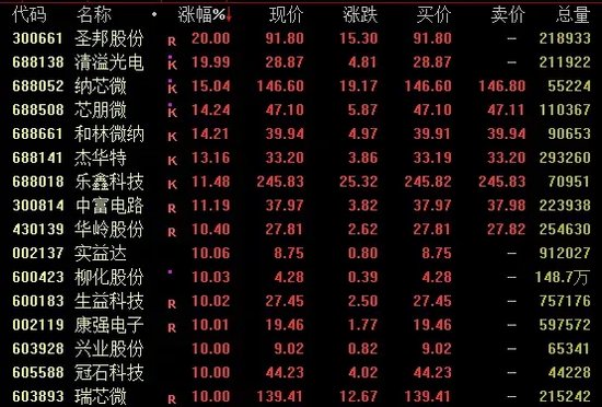 半导体、芯片股盘中大幅拉升,截至收盘,圣邦股份、清溢光电20%涨停,纳芯微涨超15%,乐鑫科技等涨超10%,实益达、柳化股份、康强电子、瑞芯微等多股涨停;中芯国际A股涨超6%,全日成交超110亿元,位居A股成交额第二位。