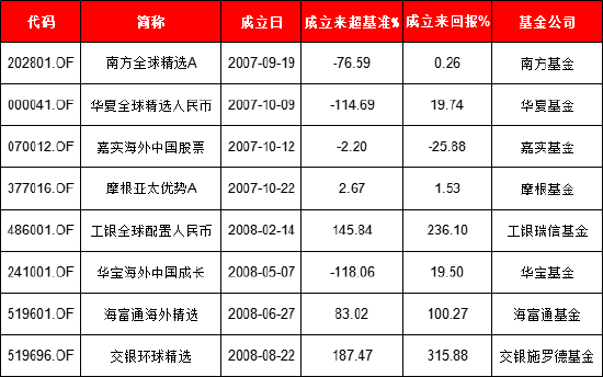 与2007年形成鲜明对比的是2008年成立的4只QDII基金。除了华宝海外中国成长成立以来跑输基准118%外,其他3只QDII基金全部大幅跑赢业绩基准。这一批基金成立时,全球金融市场已经历了危机的洗礼,资产价格处于相对低位,为基金建仓提供了绝佳的机会。基金管理人能够以更合理的价格配置资产,随着全球经济的逐步复苏,这些基金得以充分享受市场反弹带来的红利,从而实现了超越业绩基准的表现。