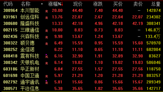 6G概念盘中强势上扬,截至收盘,本川智能20%涨停,创远信科、隆盛科技涨超13%,三维通信、兴森科技亦涨停,硕贝德、金信诺等涨超6%。