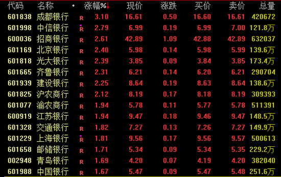 银行板块盘中发力拉升,截至收盘,成都银行涨超3%,中信银行、招商银行、北京银行、光大银行、建设银行等涨逾2%。