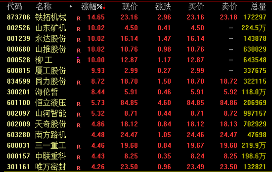 工程机械板块大幅走高,截至收盘,铁拓机械涨近15%,山东矿机、永达股份、山推股份、柳工、厦工股份等涨停,三一重工、中联重科涨超4%。