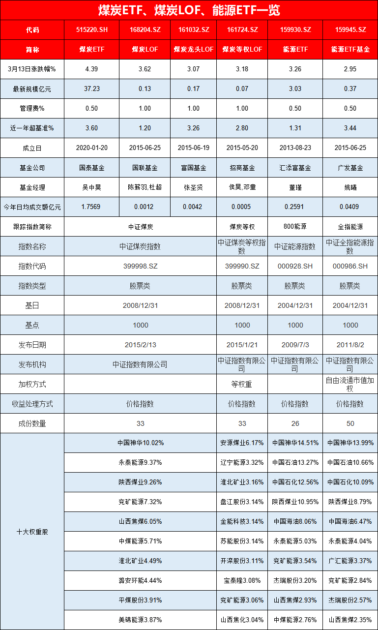 3月13日,煤炭板块强势领涨,多只相关基金单日涨幅超3%。在市场热度飙升的背景下,投资者面临选择难题:煤炭ETF、LOF、能源ETF等产品,究竟哪只更值得配置?本文从跟踪指数、规模、流动性、管理费率、超额收益五大核心维度展开对比,助您抓住投资机遇。