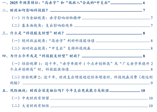 3、风险挑战:财政是否会深度缺位,导致系统性风险偏好下行、影响科技股乃至全市场估值水平?风险或较小——从两个预算信号看,今年财政的支出兜底能力或较强:一是中央财政有预留,二是大省财政有韧性。