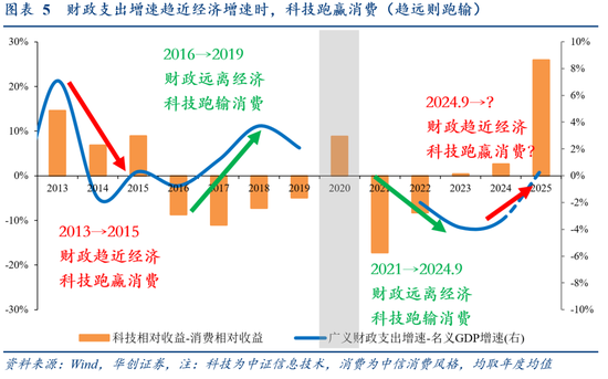 (二)经验规律2:近十年,财政支出增速趋近经济增速时,科技跑赢消费(趋远则跑输)