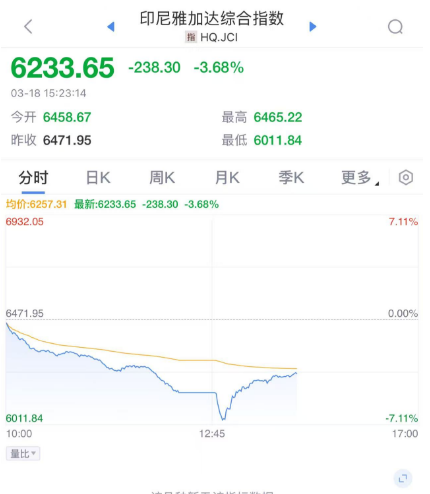 3月18日,印尼股市突然崩盘,雅加达综合指数一度暴跌7.1%,创下自2011年9月以来的最大单日跌幅,并触发了自新冠疫情以来的首次交易暂停。