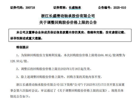 3月17日晚间,长盛轴承发布公告称,鉴于近期公司股票价格持续超出回购股份方案拟定的回购价格上限,基于对公司未来持续稳定发展的信心和对公司价值的认可,同时为了保障本次回购股份方案的顺利实施,公司将回购价格上限由66.80元/股调整为128.50元/股,调整后的回购股份价格上限自3月18日起生效。