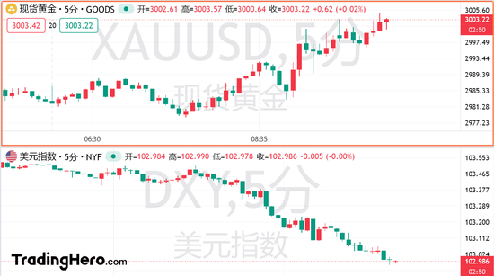 另外,美国国债在周一大幅下挫后企稳,美国和欧洲股市的期货合约也上涨。美元指数日内跌超0.5%,报102.99。现货黄金重回3000美元关口上方。