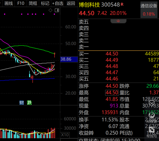 在一季报业绩利好的影响下,博创科技今日早盘大幅高开,短短5分钟左右即封上“20cm”涨停板。截至收盘,该股依然有逾4万手封单。