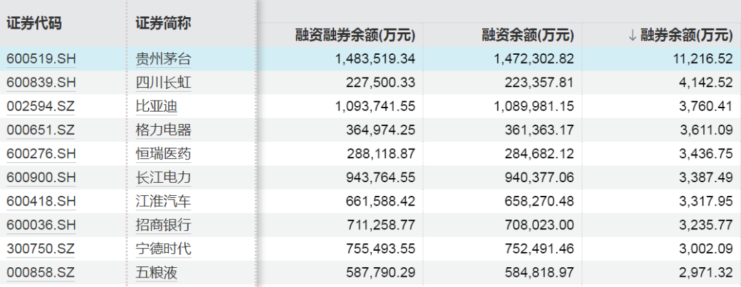 Wind数据显示,截至4月30日,A股市场融券余额居前的股票分别为贵州茅台、四川长虹、比亚迪,融券余额分别为1.12亿元、0.41亿元、0.38亿元。