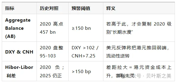 2025:注入后结余仍不到 2020 峰值一半;若美元反弹、息差再拉大,港元或回到弱方区间→ Hibor 重新抬升。资金面“松弛度”较难复制 2020 全牛。