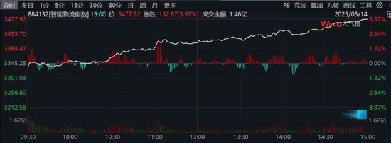 港口、物流股午后持续走高,智能物流指数尾盘拉升扩大涨幅至近4%。消息面上,今日(5月14日)12时01分起,我国对原产于美国的进口商品加征关税调整措施开始实施。美国白宫官网发布行政命令,修正价值低于800美元小额包裹的从价关税税率,从120%降低到54%。