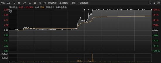 午后,券商股放量快速拉升,板块指数一度飙涨逾5%,仅半小时成交就超过昨日全天成交。板块内所有个股上涨,锦龙股份、红塔证券强势涨停,广发证券、华西证券等涨幅居前。