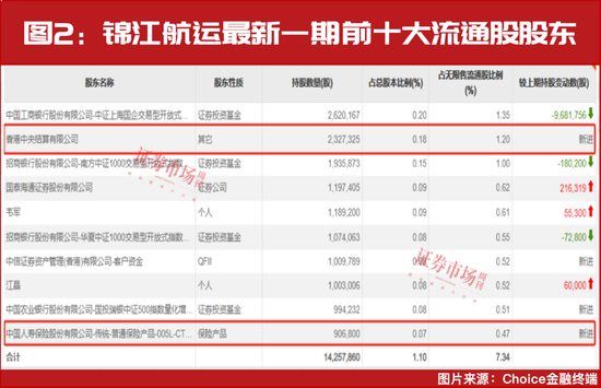 如锦江航运,在今年一季度末,“险资”中国人寿保险股份有限公司-传统-普通保险产品即新进现身公司的前十大流通股股东,并位列公司的第十大流通股股东。同样新进现身的还有香港中央结算有限公司,其一举成为公司的第二大流通股股东(见图2)。