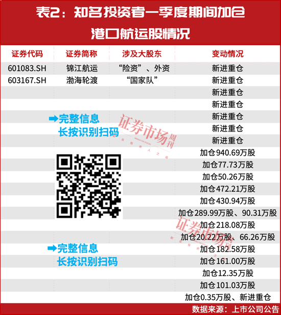 综合来看,知名投资者在今年一季度期间加仓的港口航运股共有20只(见表2,完整名单可扫描或长按识别下方二维码,“加入学习”即可免费领取)。此外,重庆港和南京港两只港口企业则继续获得有“中国十大牛散”之称的徐开东的无变动持有。