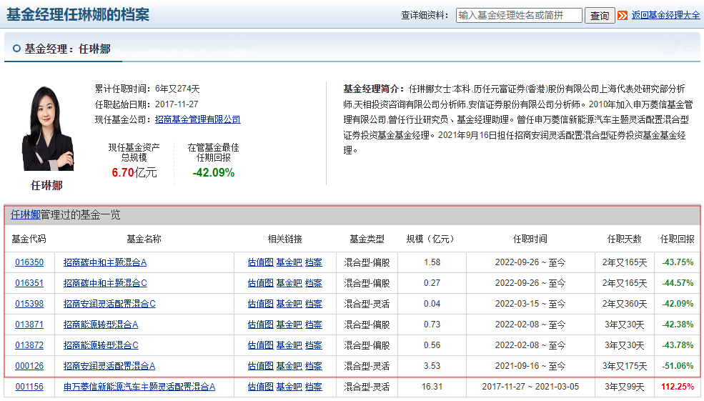 截至公开数据披露节点,其在管的招商碳中和主题混合A任职回报为-43.75%,C类份额更是跌至-44.57%;招商安润灵活配置混合C任职回报-42.09%,招商能源转型混合A、C类份额分别录得-42.38%、-43.78%,招商安润灵活配置混合A的亏损幅度甚至高达-51.06%。