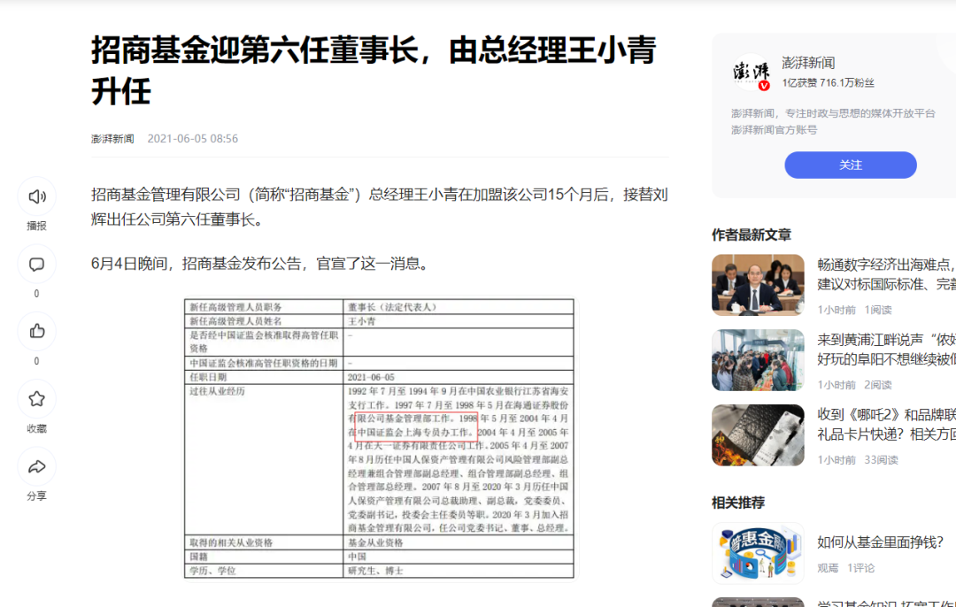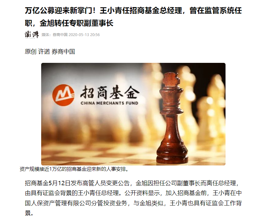 招商基金董事长王小青的履历不可谓不亮眼:曾在中国证监会上海专员办工作,后又在人保资产分管投资业务。