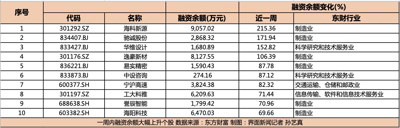 东财Choice数据显示,近一周内,融资余额大幅上升的个股前五位分别是海科新源、驰诚股份、华维设计、逸豪新材和易实精密。