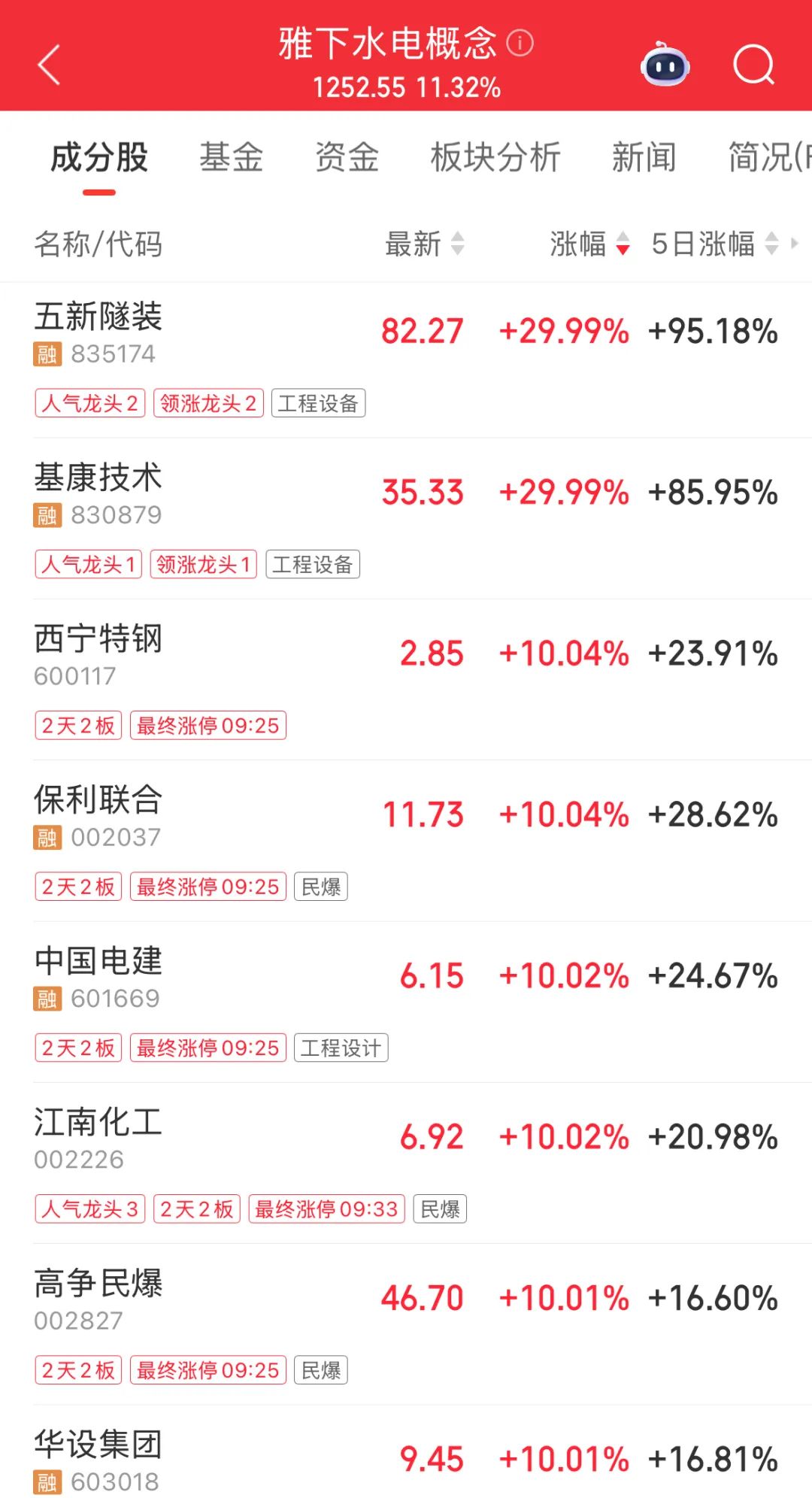 今日(7月22日),A股三大指数开盘后下跌。盘面上,雅下水电概念股继续活跃,中国电建、中国能建、西宁特钢、保利联合(维权)、高争民爆、华新水泥、苏博特等再度一字涨停;特高压、水泥板块跟进涨势。