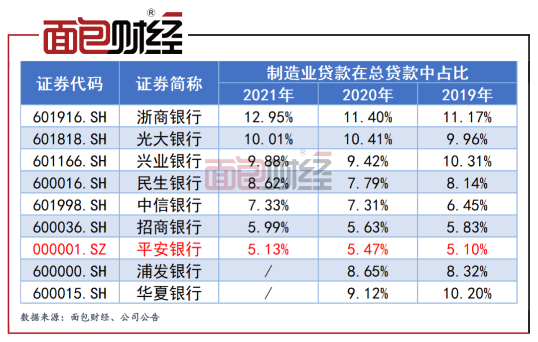 截至2022年4月26日,除浦发和华夏银行以外,其余股份制银行均已发布年报,与其他银行相比,近三年平安银行制造业贷款占比均垫底。