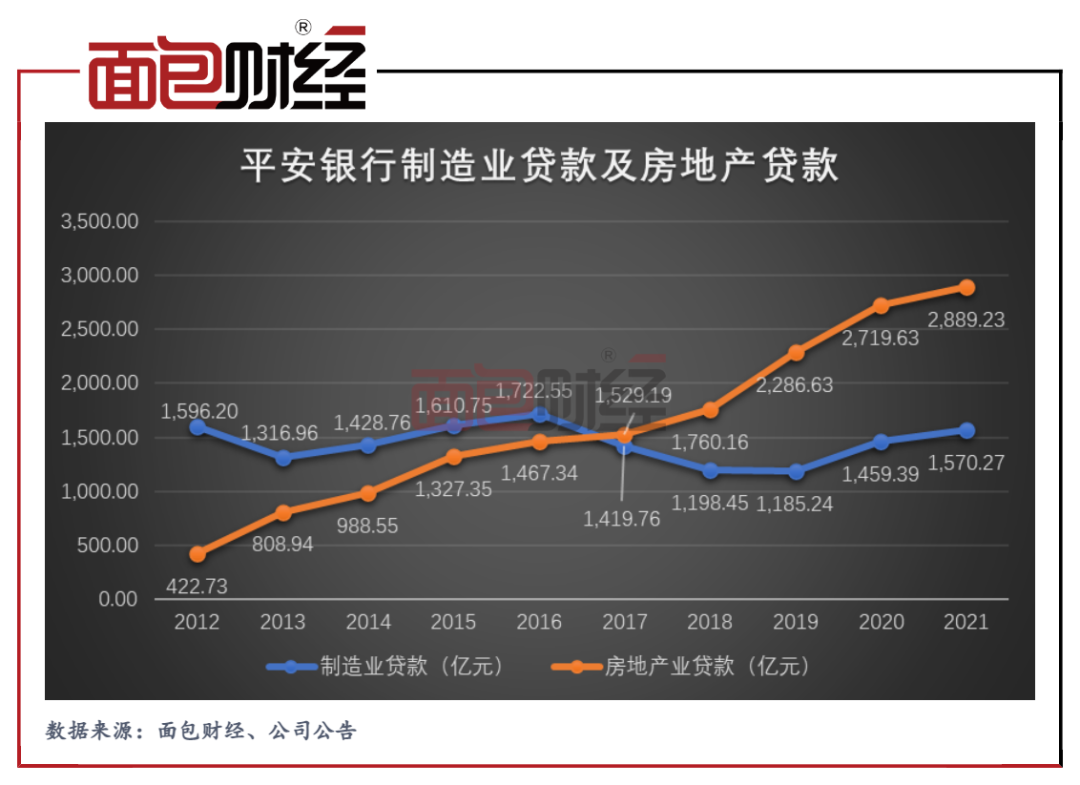 2012至2021年,平安银行的制造业(轻工业)在总贷款中的占比,从22.15%下降到5.13%。