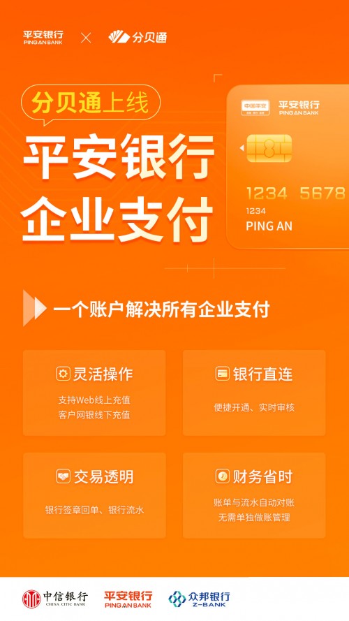 近日,分贝通正式上线「平安银行」付款功能,成功打通第二家股份制银行,让客户在App付、虚拟卡付、网银付方面具备更自由的账户选择,进一步推动“一个账户”在各企业中被广泛使用。