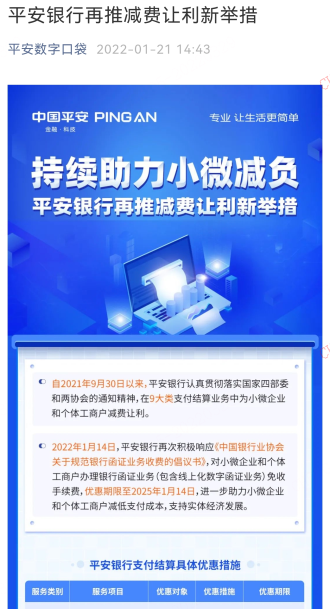 2022年1月,平安银行再次积极响应《中国银行业协会关于规范银行函证业务收费的倡议书》,对小微企业和个体工商户办理银行函证业务(包含线上化数字函证业务)免收手续费,在延续前期降费措施的同时,持续助力小微减负,再推减费让利新举措,让广大人民群众实实在在享受政策的“红利”。