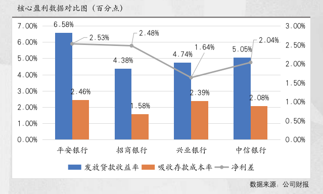 零售贷款的高占比,使得平安银行在资产端发放贷款赚取的收益率普遍高于同行。2019年,平安银行资产端发放贷款的收益率为6.58%,优势明显。