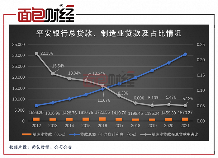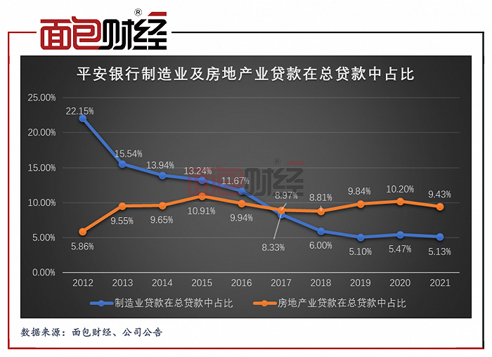 2012至2021年,平安银行的制造业(轻工业)在总贷款中的占比,从22.15%下降到5.13%。