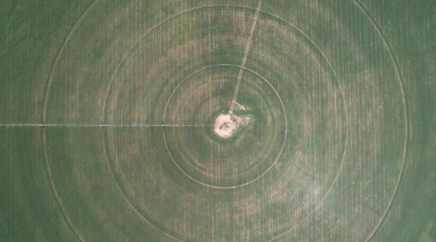圣牧牧场为圆形设计,安装了先进的自动灌溉设备,设备一端定点在圆中心,一端伸至外缘,设备像时针一样转圈浇水,均匀喷洒,滋养绿植。