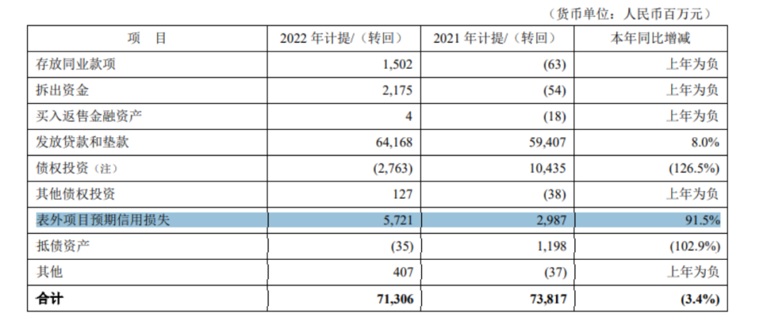 二是表外项目预期信用损失高达57亿,比2021年几乎翻了一倍。