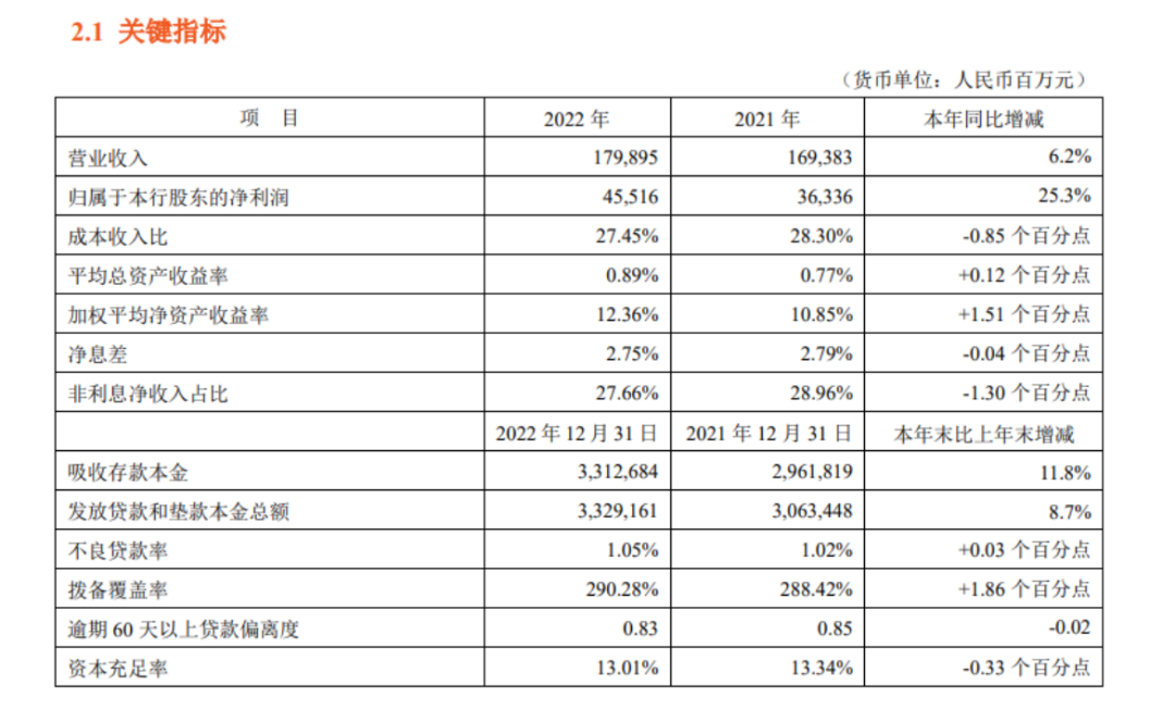 数据显示,2022年,平安银行实现营业收入1,798.95亿元,同比增长6.2%;实现净利润455.16亿元,同比增长25.3%。