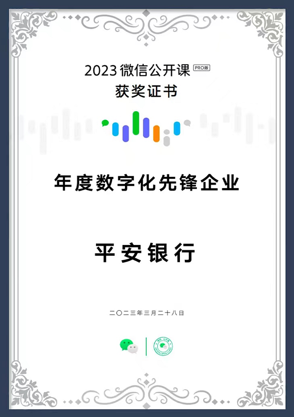 3月28日,平安银行亮相2023微信公开课PRO,凭借领先数字科技打造的智能化银行3.0新模式,结合企业微信强大的生态连接、精准服务能力,业内首创金融全旅程陪伴服务,继去年之后再度荣获“数字化先锋企业大奖”。