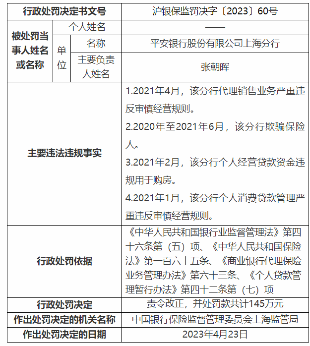 据沪银保监罚决字〔2023〕60号罚单,平安银行上海分行主要违法违规事实包括:2021年4月,该分行代理销售业务严重违反审慎经营规则;2020年至2021年6月,该分行欺骗保险人;2021年2月,该分行个人经营贷款资金违规用于购房;2021年1月,该分行个人消费贷款管理严重违反审慎经营规则。