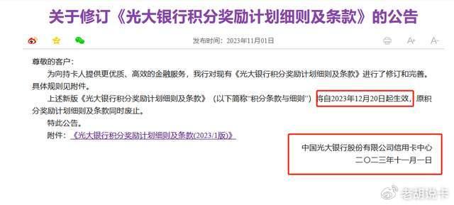 上个月,光大银行发布新的「积分规则调整公告」,于2023年12月20号生效