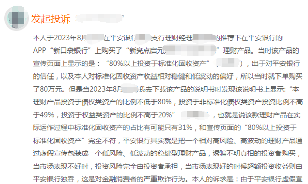 具体来看,投诉人在黑猫平台上投诉称:“因当事人年龄过大,平安银行一客户经理代为操作,并替当事人下载并激活手机银行,其多次强调是走流程,同时还进行了风险评估评级操作,在当事人不知情的情况下,给予了当事人R4的积极型评级。在推介销售产品时,未向当事人充分说明产品存在的潜在风险,未根据当事人风险偏好、认知和承受能力以及财务状况,引导其作出合理选择。”