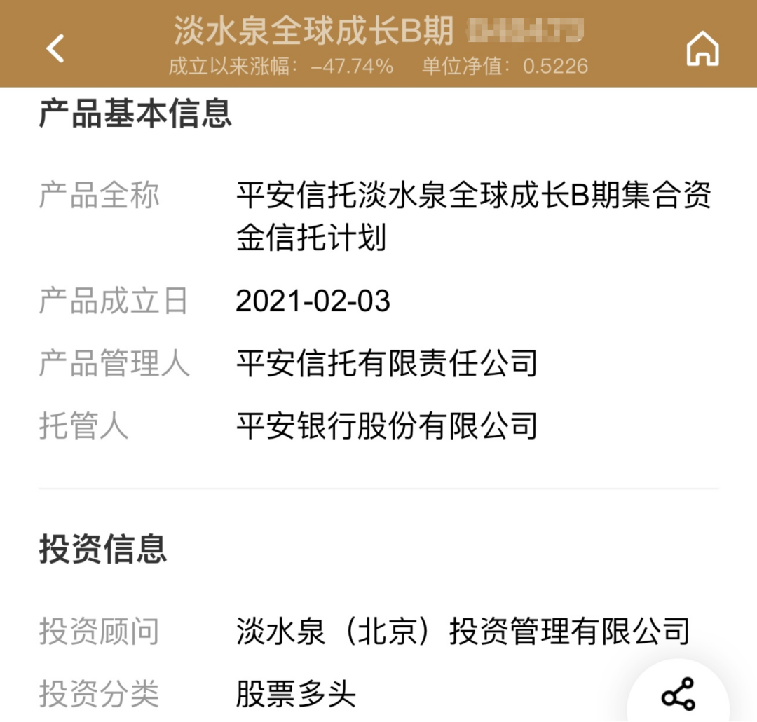 平安口袋银行App显示,“淡水泉全球成长B期”是一款权益类投资产品,自成立以来的涨幅为-47.74%,单位净值0.5226,起购金额100万元,风险等级为“R4”中高风险。