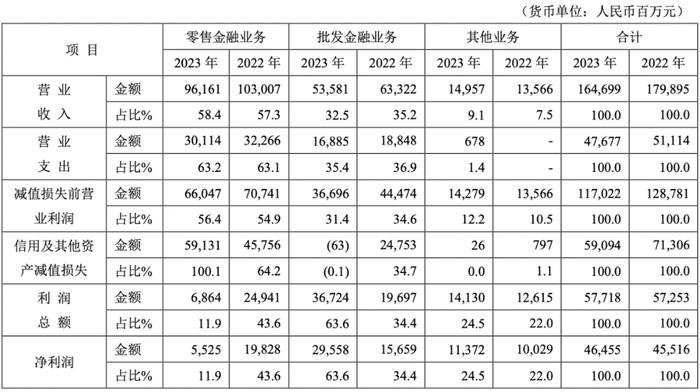 如果看平安银行2023年零售金融营业收入占比58.4%,还延续上升趋势同比略升1.1个百分点;不过,零售金融业务的利润总额占比仅为11.9%,同比大幅下降了31.7个百分点,零售利润从2022年的249亿元,大幅减少至2023年的68.64亿元。