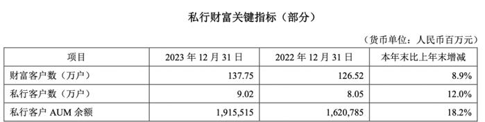 2023年,平安银行管理零售客户资产(AUM)40311.77 亿元,较上年末增长 12.4%,全年零售业务营业收入占比 58.4%。其中私行客户 AUM 余额 19,155.15 亿元,较上年末增长18.2%。
