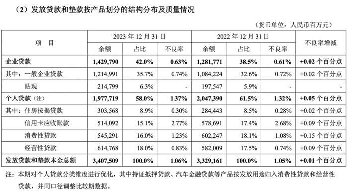 2023年,平安银行缩减零售贷款,个人贷款余额 19777亿元,较上年末下降 3.4%。其零售贷款投放增减明显,一方面,主动做大中低风险客群,加大住房按揭、持证抵押、新能源汽车贷款投放力度。其中,住房按揭贷款余额 3,035.68 亿元,较上年末增长6.7%;经营性贷款余额 6,147.68 亿元,较上年末增长 5.6%;另一方面,平安银行消费性贷款余额较上年末下降 9.5%,信用卡应收账款余额较上年末下降 11.2%。