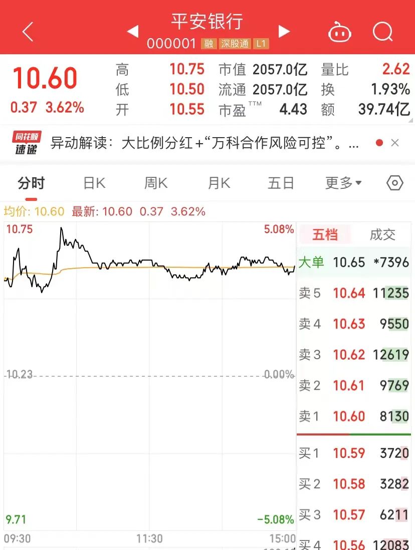 平安银行大幅提高分红比例,股价也积极反应。3月15日当天,平安银行股价大涨3.62%,涨幅位居A股银行股之首,收报10.6元,总市值达2057亿元。