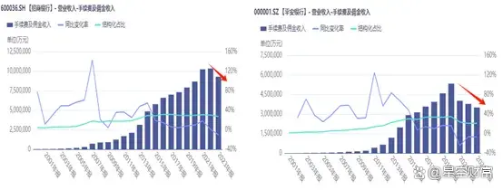 非息收入的关键在于银行中收,即中间业务创造的手续费及佣金收入。而从数据来看,2023年,这两大行的手续费及佣金收入分别同比-10.19%、-7.18%,其中平安银行,更是已经连降多年。