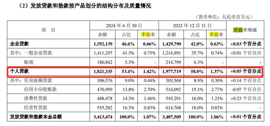 与此同时,平安银行的不良率却在上升。截至2024年6月末,平安银行不良贷款率1.07%,较上年同期上升0.01个百分点。其中,个人贷款不良率1.42%,这里面最高的就是信用卡应收账款,不良率达到2.7%,但较去年底已经有所下降。