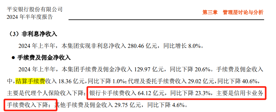 平安银行半年报显示,上半年,集团手续费及佣金净收入129.97亿、同比下降20.6%。其中,结算手续费收入18.36亿、同比下降1%,代理及委托手续费收入29.02亿、同比下降40.6%,银行卡手续费收入64.12亿、同比下降23.3%。