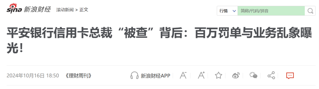 在裁员传闻之后不久,今年10月又传出平安银行信用卡中心总裁刘显峰“失联”的消息,这一消息传出之后,也有消息说刘显峰早在国庆节前就已经失联,疑似被协助调查,并且平安银行已将信用卡中心负责人更换。