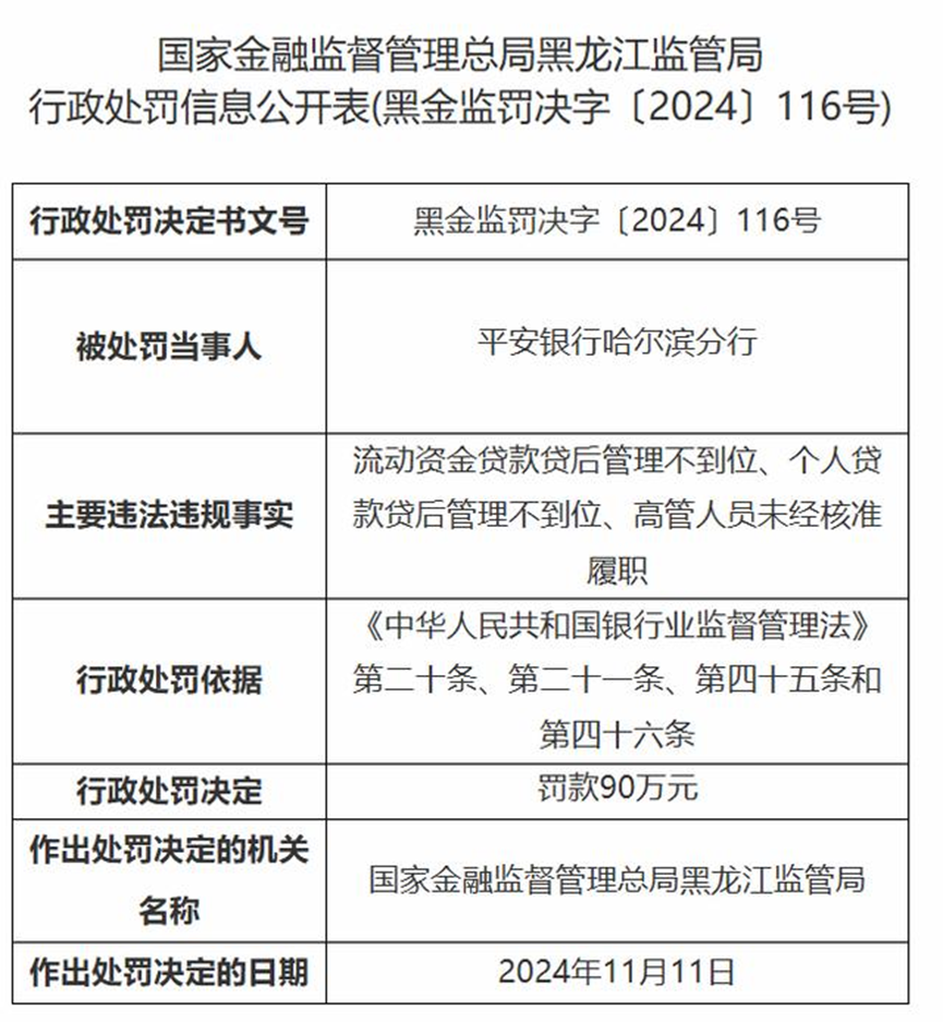 两天后,因流动资金贷款贷后管理不到位、个人贷款贷后管理不到位、高管人员未经核准履职,平安银行哈尔并分行又被国家金融监督管理总局黑龙江监管局罚款90万元。与此同时,该公司相关工作人员被警告。